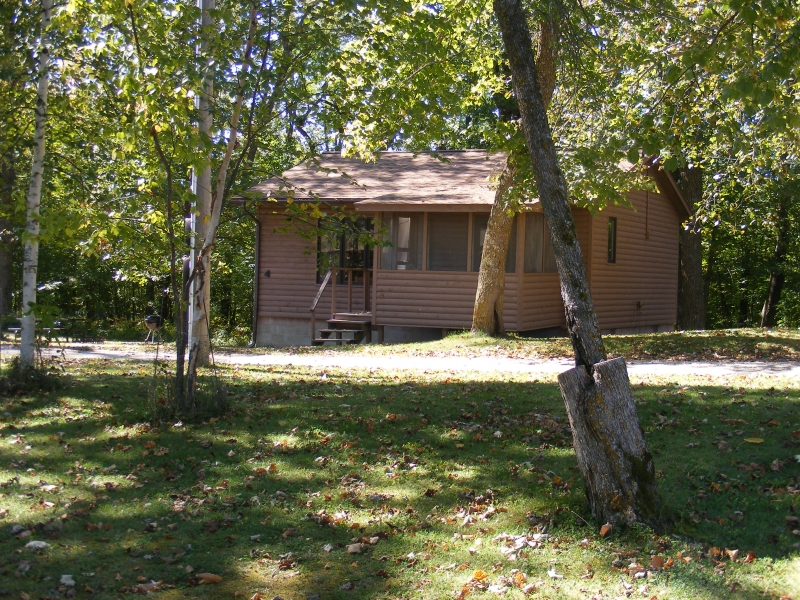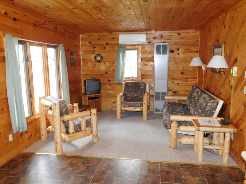 Two bedroom cabin with log siding and knotty pine interior. Each bedroom has one queen sized bed. There is carpeting in the living room and in all the bedrooms. The living room has log furniture with a futon couch. The kitchen is fully furnished and has a dining area. The bathroom has a tub with a shower. The cabin has air conditioning and heat. Screen porch with table and chairs on the front of the cabin overlooking the lake.