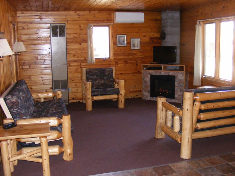 Three bedroom cabin with log siding and knotty pine interior. Each bedroom has one queen sized bed. The living room has log furniture with a futon couch and a electric fireplace. There is carpeting in the living room and in all the bedrooms. The kitchen is fully furnished with a dining area. The bathroom has a tub with a shower. The cabin has air conditioning and heat. There is a screen porch with table and chairs on the front of the cabin overlooking the lake.